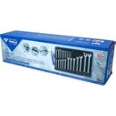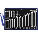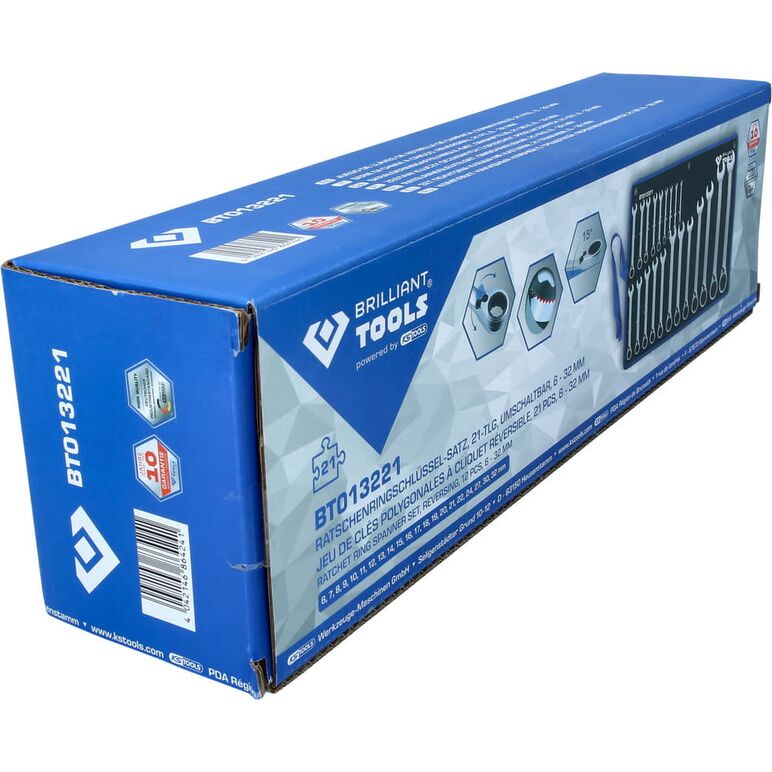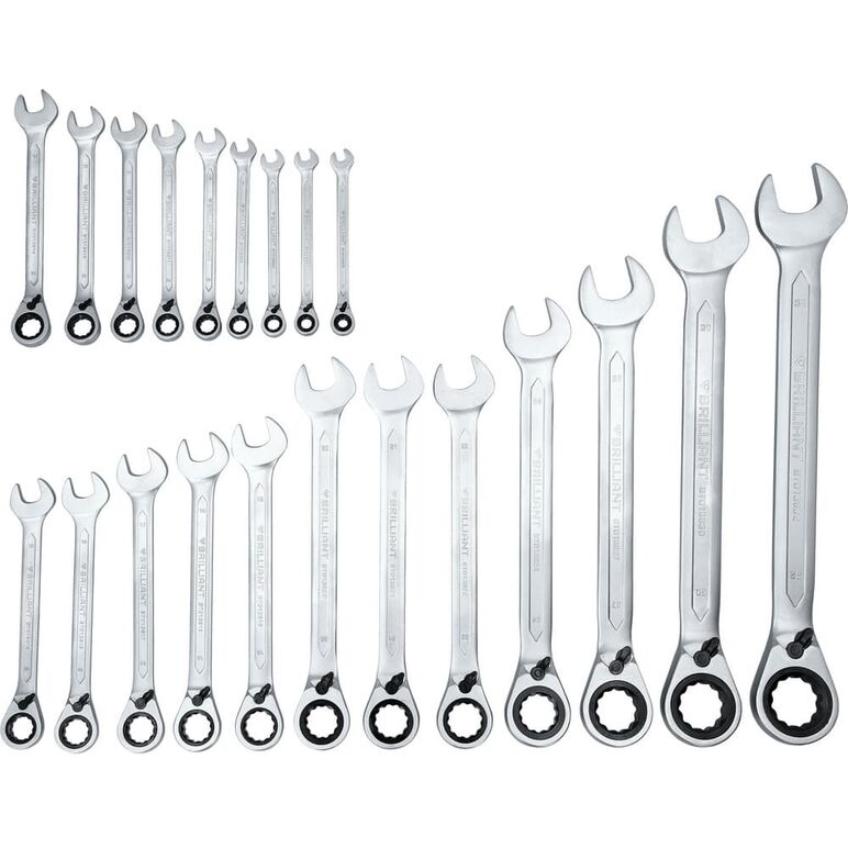 Der 21-teilige BRILLIANT TOOLS Ratschenringschlüssel-Satz BT013221 wird in Anlehnung an DIN 3113 gefertigt. Die metrischen Ringschlüssel mit Ratschenfunktion sind feinverzahnt mit 72 Zähnen und haben einen Rückschwenkwinkel von 5°. Die Schlüssel haben einen umschaltbaren Ratschenkopf der um 15° abgewinkelt ist. Die Maulstellung ist ebenfalls um 15° abgewinkelt. Eine Umstellung der Ratschenfunktion (rechts / links) erfolgt komfortabel durch Bewegen des Umschalters. Die Oberfläche ist matt verchromt, dadurch liegt er auch besonders gut in der Hand. Der Ratschenringschlüssel-Satz mit den Größen 8 mm bis 32 mm wird in einer praktischen Aufbewahrungstasche geliefert die mit Aufhängeösen ausgestattet ist.