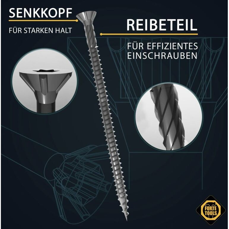 Die FORTE Tools Holzschraube mit Torx Aufnahme garantiert dem Anwender eine hohe Flexibilität durch universelle Einsetzbarkeit in unterschiedlichen Materialien wie Holz, Kunststoff oder Metallblech. Der Senkkopf sorgt für eine saubere und bündige Versenkung der Schraube in Holz. Die Torx Aufnahme erlaubt eine bessere Kraftübertragung auf die Schraube, höhere Standzeiten sowie ein schnelleres Einfädeln der Schraube mit zugleich besserem Passsitz am Werkstück. Zusätzlich sorgt das Wellenprofil am vorderen Gewinde für ein leichtes und sicheres Verschrauben. Die Verzinkung sorgt für einen Korrosionsschutz und eine deutlich höhere Oberflächenhärte als herkömmliche blanke Schrauben, wodurch sich die Einsatzmöglichkeiten um ein vielfaches im Außenbereich erweitern lassen.