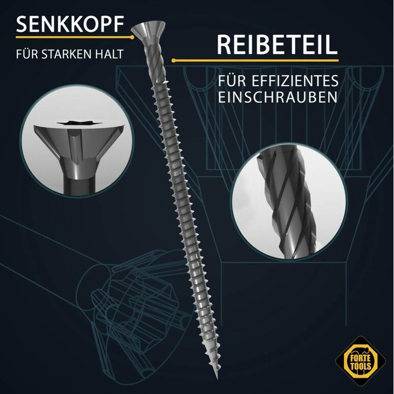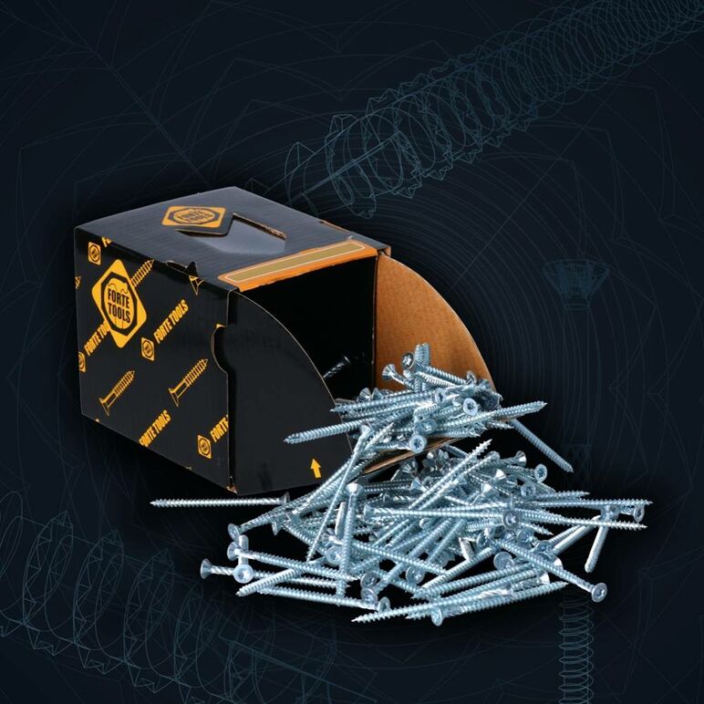Die FORTE Tools Holzschraube mit Torx Aufnahme garantiert dem Anwender eine hohe Flexibilität durch universelle Einsetzbarkeit in unterschiedlichen Materialien wie Holz, Kunststoff oder Metallblech. Der Senkkopf sorgt für eine saubere und bündige Versenkung der Schraube in Holz. Die Torx Aufnahme erlaubt eine bessere Kraftübertragung auf die Schraube, höhere Standzeiten sowie ein schnelleres Einfädeln der Schraube mit zugleich besserem Passsitz am Werkstück. Zusätzlich sorgt das Wellenprofil am vorderen Gewinde für ein leichtes und sicheres Verschrauben. Die Verzinkung sorgt für einen Korrosionsschutz und eine deutlich höhere Oberflächenhärte als herkömmliche blanke Schrauben, wodurch sich die Einsatzmöglichkeiten um ein vielfaches im Außenbereich erweitern lassen.