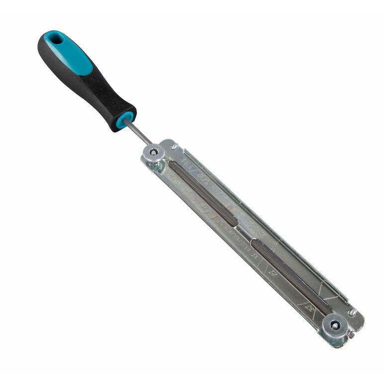 Feilenhalter mit Rundfeile 4,0 mm und Kettenmesslehre, mit weichem Feilverhalten