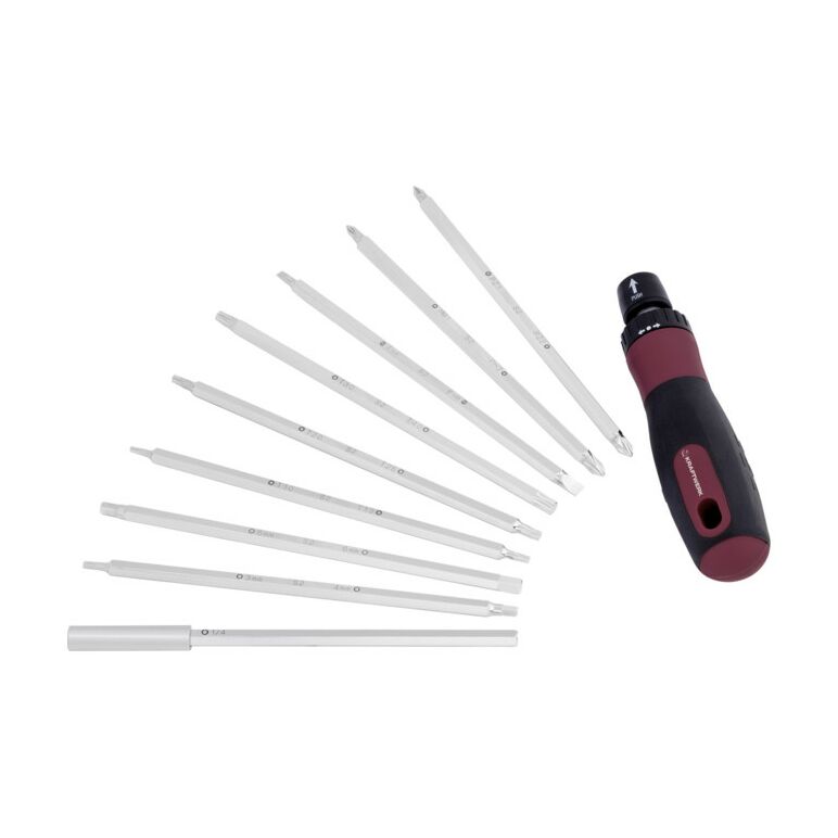 • Enthalten sind 8 Doppelend-Klingen (entspricht 16 Schraubenprofile) für Schlitz-, Kreuzschlitz- PH und PZ, Torx®- und Innensechskantschrauben sowie einer Klinge zur Aufnahme von 1/4 Zoll Bit-Einsätzen