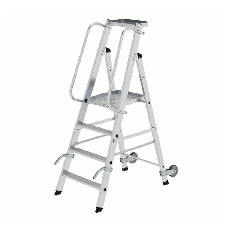 Plattformleiter aus Aluminium, Stabile Rechteckrohr-Holme, 80 mm tiefe, geriffelte Stufen, Große, trapezförmige Plattform (400 / 360 x 425 mm), 4-fach gebördelte Stufen-/Holmverbindung, Konische Holmführung für einen sicheren Stand, Zwei Handläufe für sicheren Auf- und Abstieg (liegen lose bei), Leitergelenk 'safe-cap', nivello®-Leiterschuhe mit patentierter 2-Achsen-Neigungstechnik, Praktische Ablageschale (350 x 200 mm), Starre Verbindung durch beidseitig lösbare Metallstreben (liegen lose bei), Spreizsicherung mit zwei hochfesten Perlongurten, Zwei Hubrollen Ø125 mm und Handgriffe für ein leichtes Verfahren von Ort zu Ort, Stufenabstand: 235 mm, Leiterneigung: 70°, Maximale Belastung: 150 kg