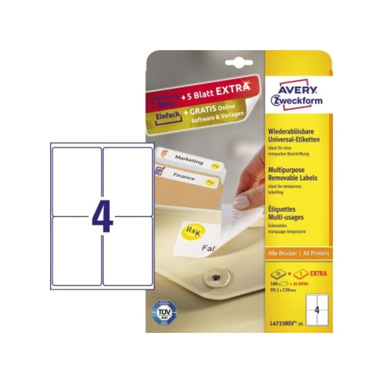 Avery-Zweckform L4733REV-25 Universal-Etiketten 99.1 x 139 mm Papier Weiß 120 St. Wiederablösbar Tintenstrahldrucker, Laserdrucker, Farblaserdrucker, Kopierer,