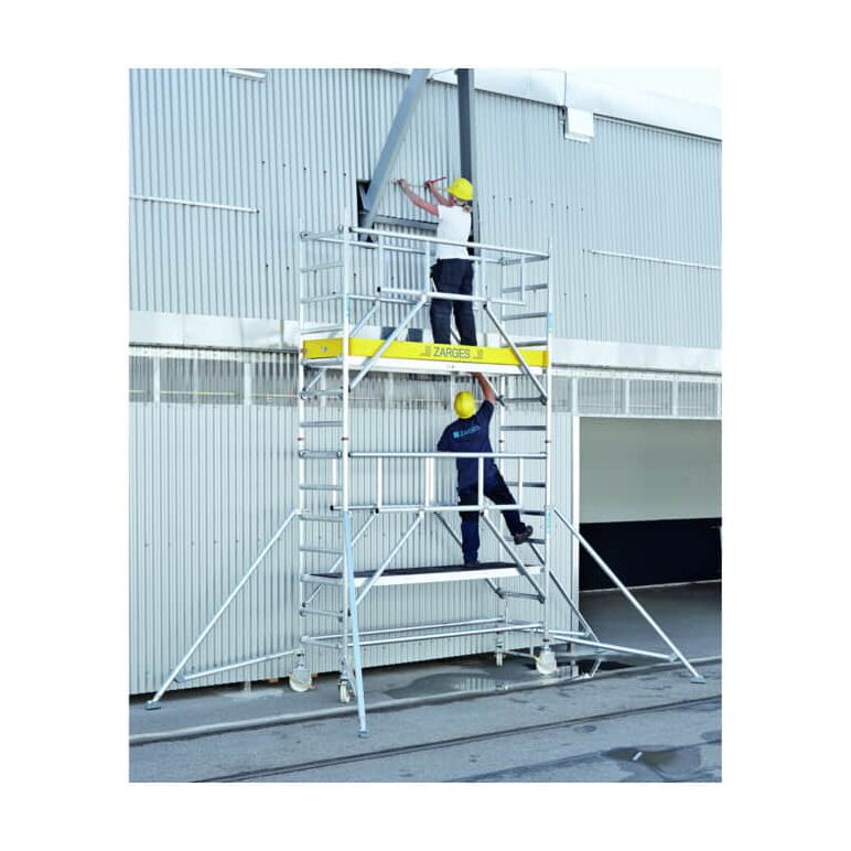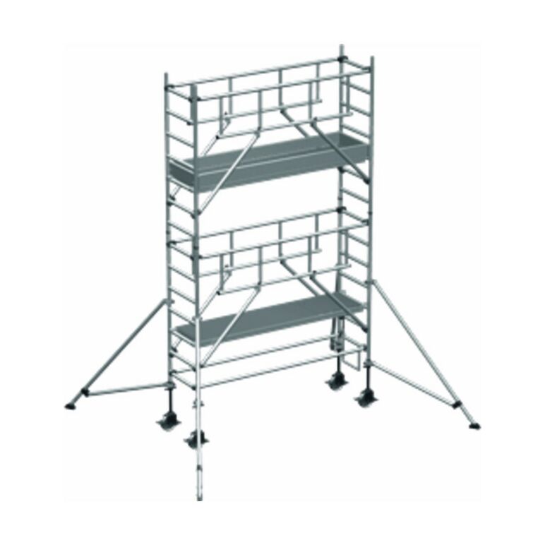 Die fahrbare Gerüstlösung für sicheren und schnellen Aufbau durch vorlaufendes Geländer. zwei Meter Plattformabstand und weniger Einzelteile.