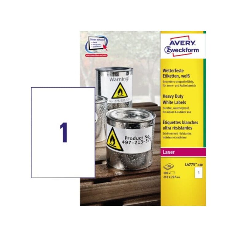 Avery-Zweckform L4775-100 Folien-Etiketten 210 x 297 mm Polyester-Folie Weiß 100 St. Permanent haftend Farblaserdrucker, Laserdrucker, Farbkopierer, Kopierer,
