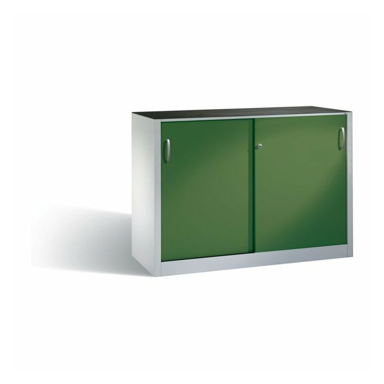 • 1x C+P Werkzeug-Beistellschrank mit Schiebetüren, innen 2 x 1 Boden, H1000xB1600xT600mm Front Resedagrün Korpus Lichtgrau