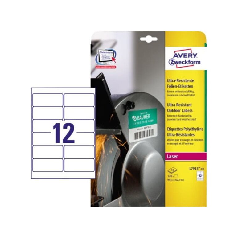 Die ultra-resistenten Folien-Etiketten von AVERY ZWECKFORM zeichnen sich durch eine hohe Strapazierfähigkeit für höchste Beanspruchungen im Innen- und Außenraum aus. Durch die Haftung auch auf schwierigen Oberflächen, eignen sie sich besonders zur Kennzeichnung in der Produktion und im Lager, zur Beschriftung von Containern oder zur Beschilderung. Die Folienetiketten sind ultra-widerstandsfähig. Zudem sind die Etiketten resistent gegen viele Lösungs- und Reinigungsmittel. Gestalten und drucken Sie Ihre Aufkleber schnell und einfach - mit den kostenlosen Avery Zweckform Etiketten Vorlagen und Software-Lösungen unter www.avery-zweckform.eu/print oder den im Microsoft® Office Paket integrierten Basis-Vorlagen.