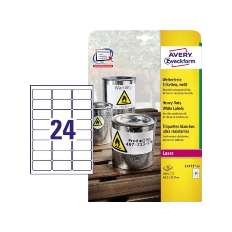 Avery-Zweckform L4773-20 Folien-Etiketten 63.5 x 33.9 mm Polyester-Folie Weiß 480 St. Permanent haftend Farblaserdrucker, Laserdrucker, Farbkopierer, Kopierer,