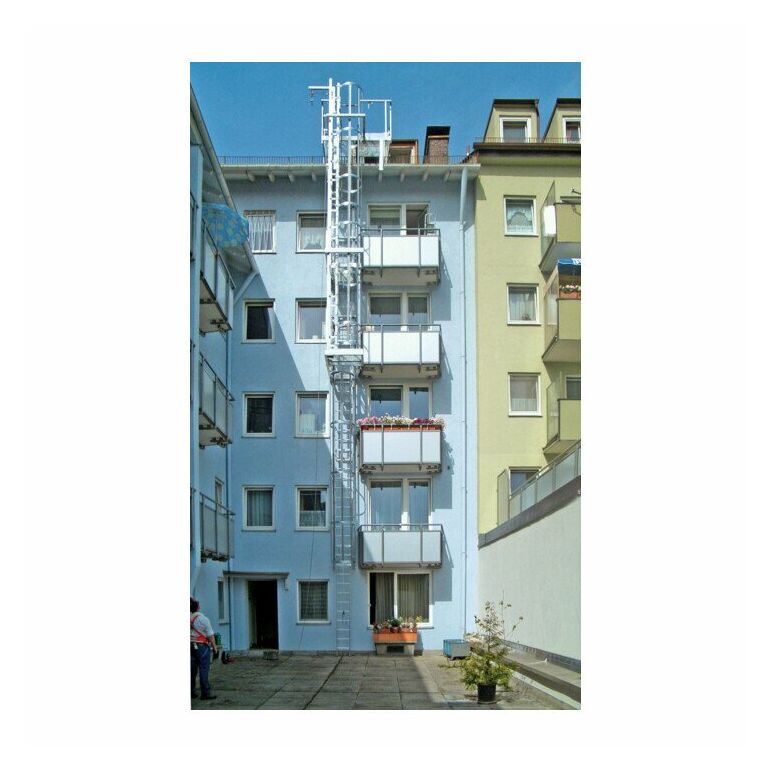 Einsatzbereich, Notleiteranlagen sind bauliche Anlagen, über die sich selbstrettungsfähige Menschen im Gefahrenfall retten oder Menschen gerettet werden können., Unabhängig von der Steighöhe gilt:, Als Absturzsicherung ist Steigschutz nicht zulässig, Bei der Planung von Notleiteranlagen, insbesondere der Zustiegssicherungen, ist die zuständige Brandschutzdienststelle mit einzubinden, Ein Nachweis für die Tragfähigkeit des Untergrunds muss für jedes Bauvorhaben durch einen verantwortlichen Sachverständigen für Standsicherheit geprüft und abgenommen werden, An ungesicherten Ausstiegsstellen sind beidseitig zur Steigleiter angebrachte oder in die Ausstiegsebene geführte Geländer erforderlich, Spalt beim Austritt darf nicht größer als 75 mm sein, Bei möglichen Absturzhöhen ab 1 m sind an Ein-, Aus- und Überstiegen Haltevorrichtungen erforderlich., Für seitliche Überstiege müssen die Leiterteile höher geführt werden, Antrittsmaß: Abstand Einstiegsebene zur ersten Sprosse 100 – 400 mm; oberste Sprosse bündig mit der Einstiegsebene, Die Spaltmaße zwischen Steigleiteranlage und Geländer dürfen maximal 120 mm betragen, Auslösemechanismus Notabstiegsleiter über Fußbedienhebel oder Sicherungsschranke, Ein vertikal bewegliches Leiterteil ist nur am untersten Leitersegment zulässig. Dieses ausfahrbare Leiterteil muss sich vor seinem Betreten selbsttätig absenken. Im abgesenkten Zustand müssen die Sprossen des ausgefahrenen Leiterteils und des untersten Leitersegments auf gleicher Höhe liegen, Zustiegspodeste müssen als Zustiegsmöglichkeiten auf Notleiteranlagen die gesamte Zustiegsöffnung (z.B. Fensterbreite) abdecken, Die senkrechte Überschneidung von aufeinander folgenden Leiterzügen muss mindestens 1.680 mm betragen, Durchstiegsöffnungen innerhalb von Balkonen sowie Zustiegsöffnungen in Balkonumwehrungen sind gegen das Abstürzen von Personen zu sichern. Die technische Ausführung muss sicherstellen, dass die Funktion dauerhaft gewährleistet ist, Die Notsteigleiter sollte auf tragfähigen, für Fluchtwege vorgesehene und gesicherte Flächen, die aus den Gefahrenbereichen führen, enden