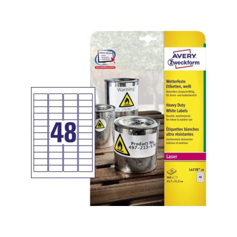 Avery-Zweckform L4778-20 Folien-Etiketten 45.7 x 21.2 mm Polyester-Folie Weiß 960 St. Permanent haftend Farblaserdrucker, Laserdrucker, Farbkopierer, Kopierer,