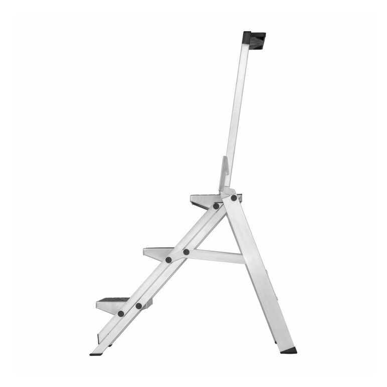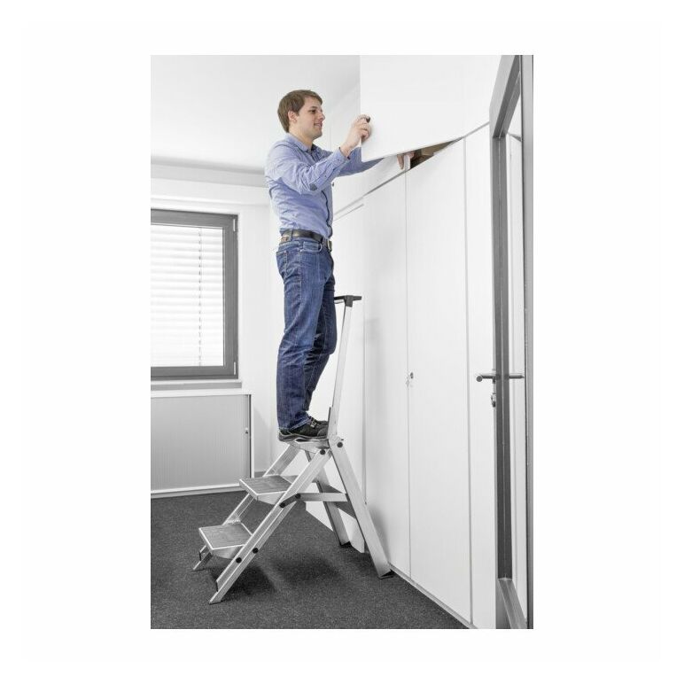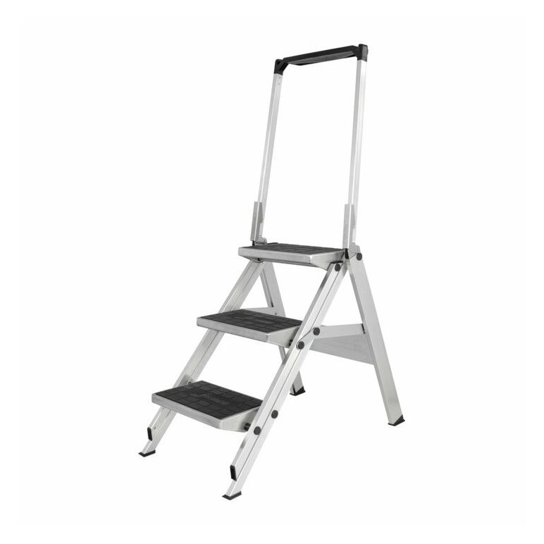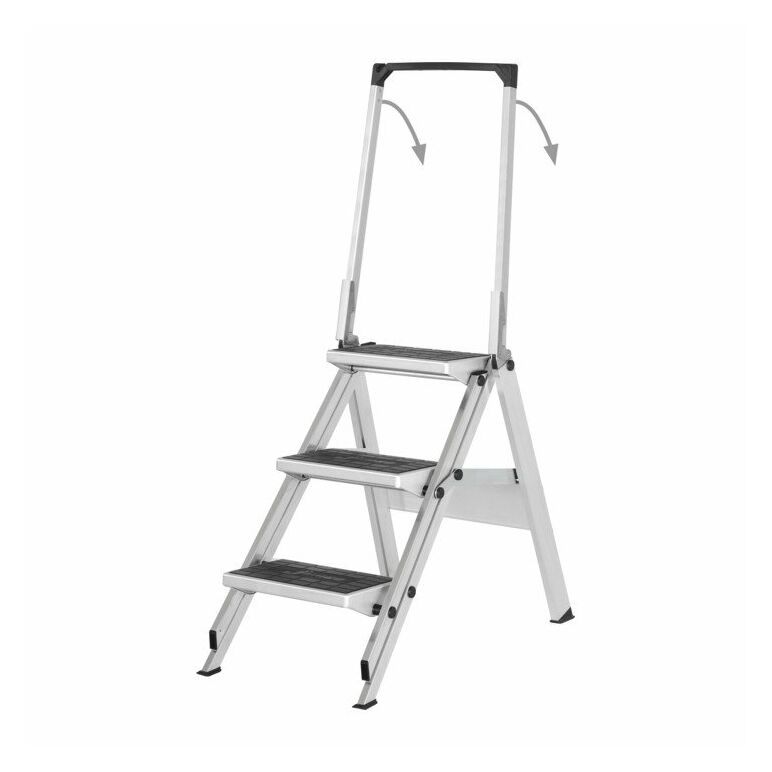 Extrem stabile, klappbare Sicherheitstreppe · Sicherer Auf- und Abstieg durch 47° Neigungswinkel · 360 mm breite und 230 mm tiefe Stufen mit rutschsicherem Gummibelag · Kräftige zug- und druckfeste Aussteifung zwischen Leiter- und Stützteil · Mit Bügel und Ablageschale
