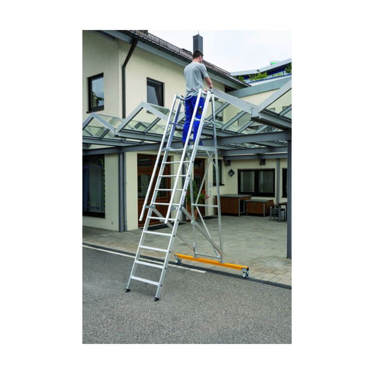 - Mit beidseitigem Handlauf, 3-seitigem Geländer und Knieleiste aus Aluminium sowie Sicherungsseil für sicheres Begehen und Stehen (GFK auf Anfrage)
