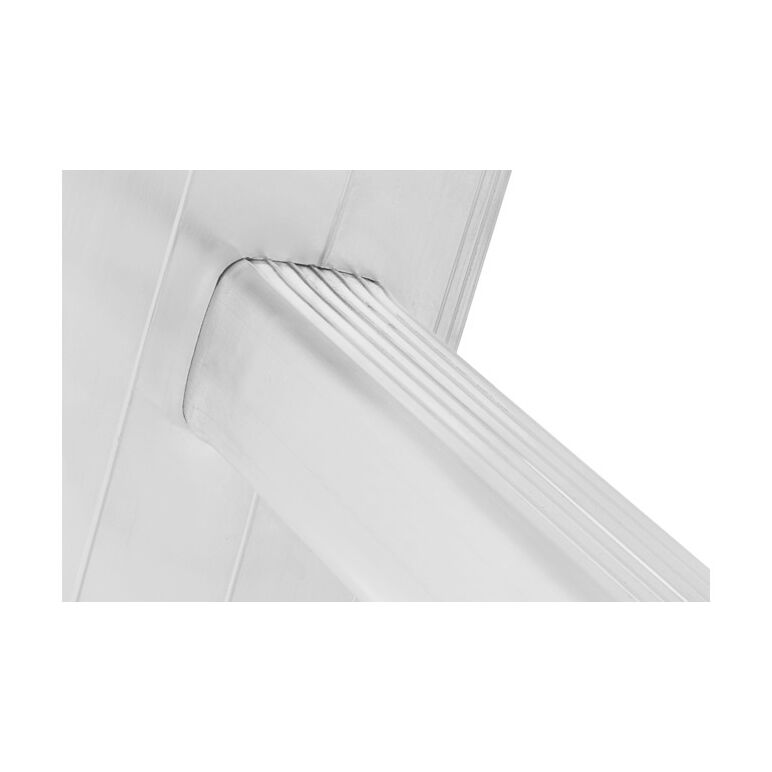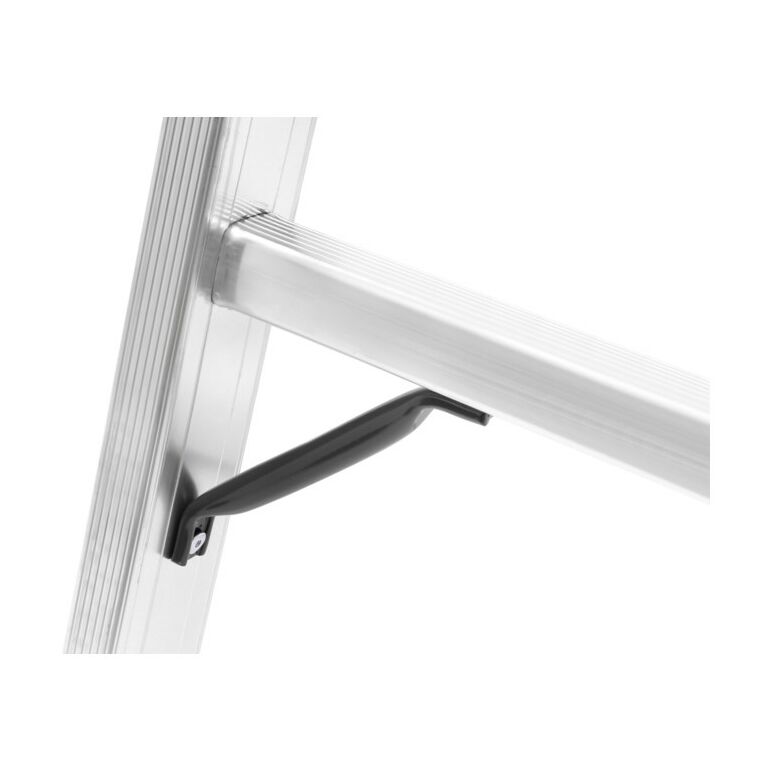 Stehleiter in konischer Form · Holme und Sprossen aus stark profiliertem Strangpressprofil, daher erhöhte Rutschfestigkeit · Mit Holm verschraubte Leiterfüße im Anstellwinkel mit großer Auflagefläche und hoher Standfestigkeit · Spreizsicherung durch hochfeste, 30 mm breite Perlongurte · Stabile Aussteifungsstreben am Antritt