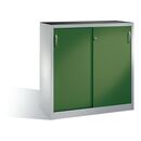 - 1x C+P Werkzeug-Beistellschrank mit Schiebetüren, innen 2 Böden, H1200xB1200xT600mm Front Resedagrün Korpus Lichtgrau