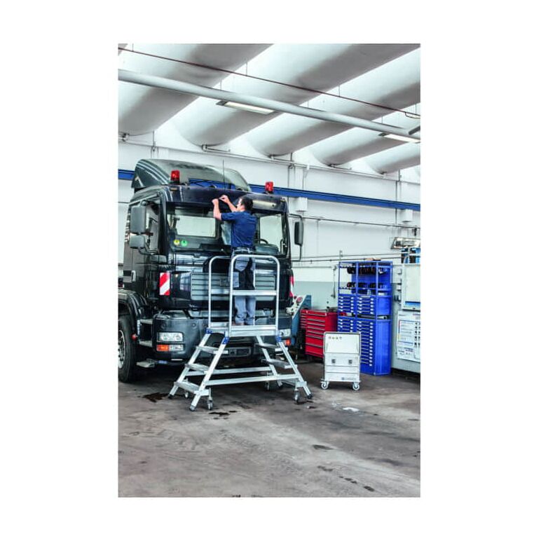 Maximale Flexibilität bei Auf- und Abstieg. größerer Arbeitsbereich auf den Stufen. und hohe Mobilität sowie sicherer Stand durch vier Federrollen.