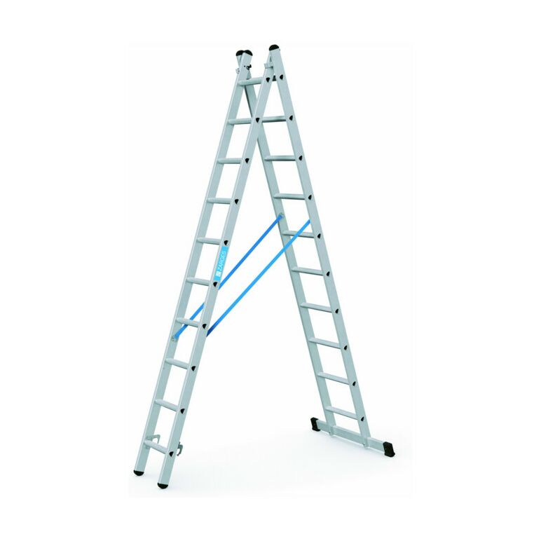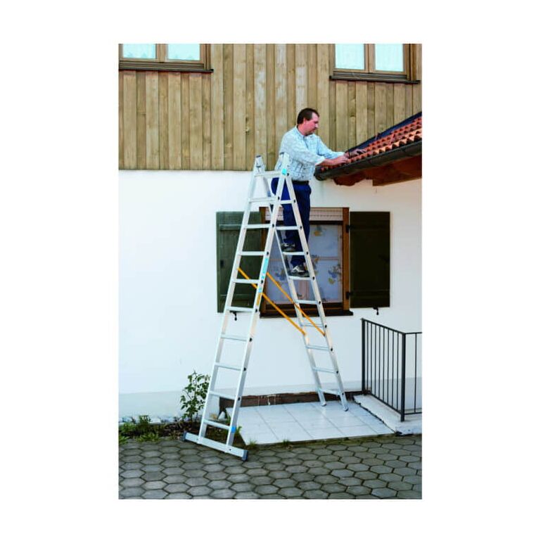 - Einsetzbar als 2-teilige Schiebeleiter oder als beidseitig begehbare Leiter