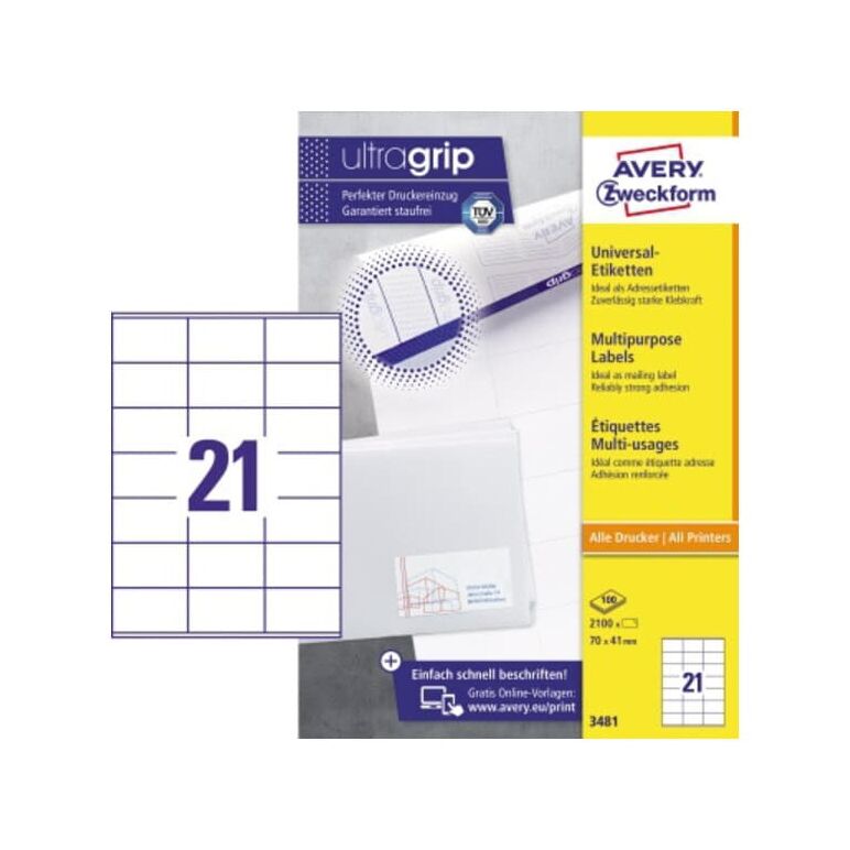 Avery-Zweckform 3481 Universal-Etiketten 70 x 41 mm Papier Weiß 2100 St. Permanent haftend Tintenstrahldrucker, Laserdrucker, Farblaserdrucker, Kopierer,