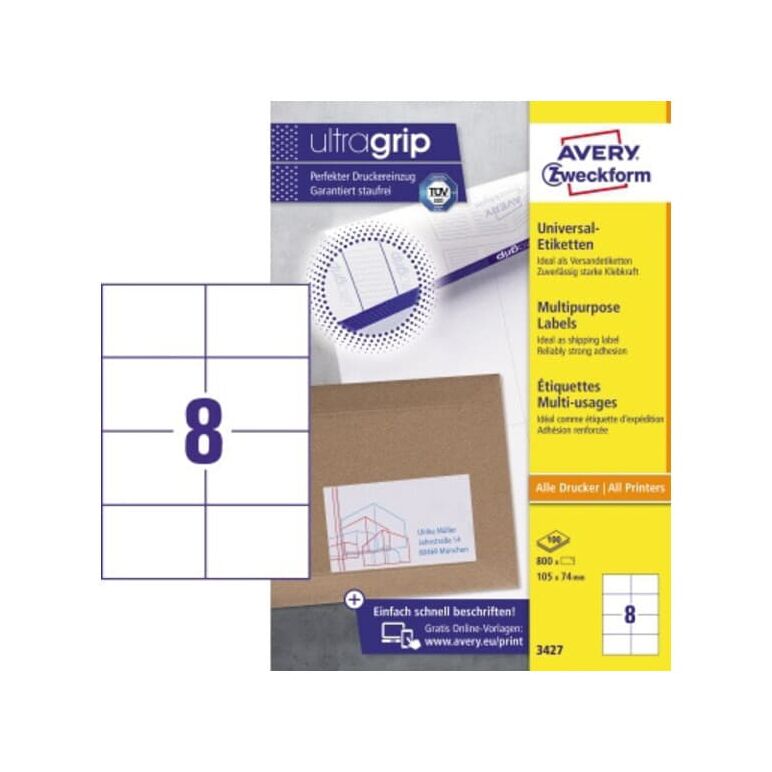 Die Universal-Etiketten eignen sich z.B. zum Organisieren von Unterlagen. Mit einzigartiger ultragrip-Technologie für einen garantiert präzisen Druckereinzug und staufreien Druckerdurchgang. Ideal für die vielseitige Beschriftung und zum Adressieren. Starke Klebkraft in Top Qualität. Universaletiketten für jeden Bedarf mit einem gestochen klaren Druckbild ohne Verwischen. Gestalten und drucken Sie Ihre Aufkleber schnell und einfach - mit den kostenlosen Avery Zweckform Etiketten Vorlagen und Software-Lösungen unter www.avery.eu/print oder den im Microsoft® Office Paket integrierten Basis-Vorlagen.