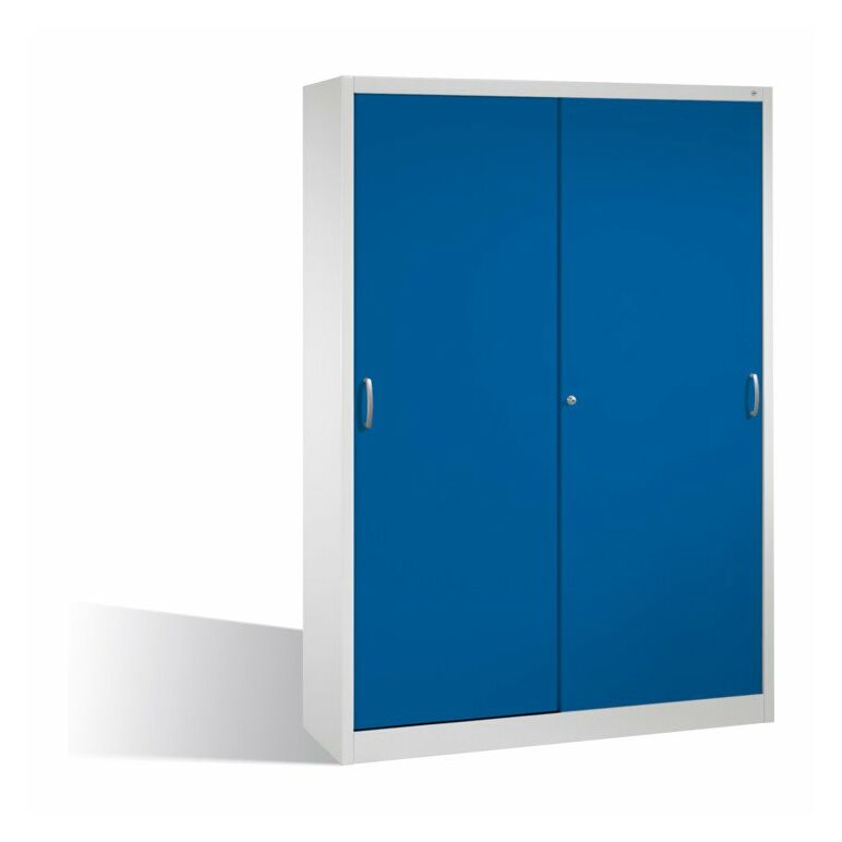 - 1x C+P Werkzeugschrank mit Schiebetüren, innen 2 x 4 Böden, H1950xB1600xT600mm Front Enzianblau Korpus Lichtgrau