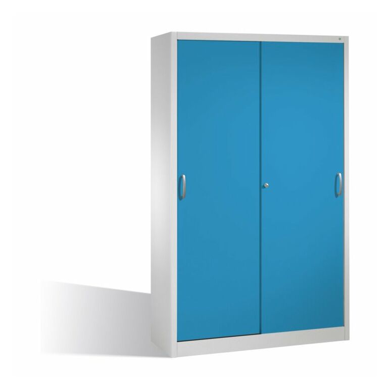 C+P Werkzeugschrank mit Schiebetüren, innen 4 Böden, H1950xB1200xT400mm Front Lichtblau Korpus Lichtgrau