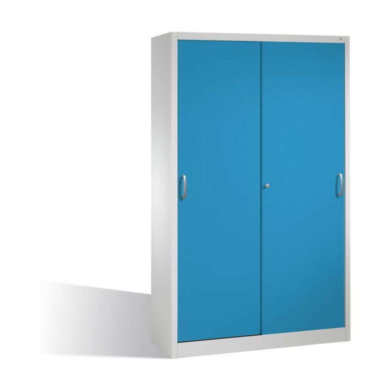 - 1x C+P Werkzeugschrank mit Schiebetüren, innen 4 Böden, H1950xB1200xT500mm Front Lichtblau Korpus Lichtgrau