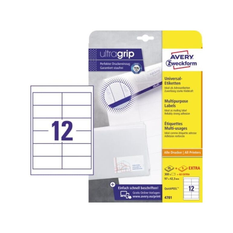 Die Universal- von AVERY ZWECKFORM eignen sich z.B. für Korrekturen. Mit einzigartiger ultragrip-Technologie für einen garantiert präzisen Druckereinzug und staufreien Druckerdurchgang. Starke Klebkraft in Top Qualität. Universaletiketten für jeden Bedarf mit einem gestochen klaren Druckbild ohne Verwischen - durch beste Tonerverankerung. Gestalten und drucken Sie Ihre Aufkleber schnell und einfach - mit den kostenlosen Avery Zweckform Etiketten Vorlagen und Software-Lösungen unter www.avery.eu/print oder den im Microsoft® Office Paket integrierten Basis-Vorlagen. Schnelle Anwendung dank QuickpeelTAbziehhilfe.
