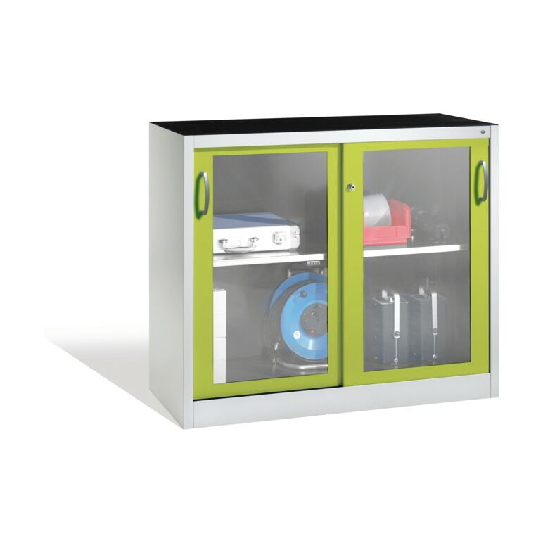 • 1x C+P Werkzeugschrank mit Sichtfenster-Schiebetüren, 1 Boden, H1000xB1200xT500mm Front Viridingrün Korpus Lichtgrau