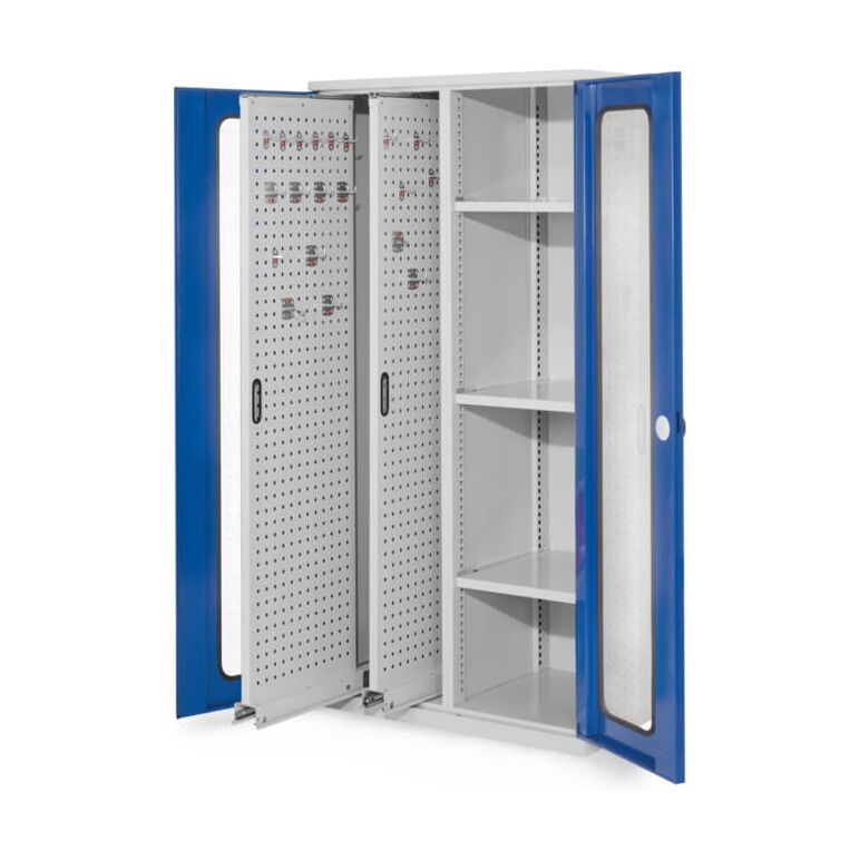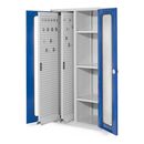 Kappes RasterPlan Vertikalschrank Modell 80, 1950 x 1000 x 600 mm, RAL 7035/5010 | Sichtfenstertür | 2 Auszüge Lochplatten, 3 Böden