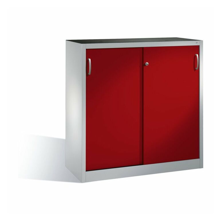 - 1x C+P Werkzeug-Beistellschrank mit Schiebetüren, innen 2 Böden, H1200xB1200xT600mm Front Rubinrot Korpus Lichtgrau
