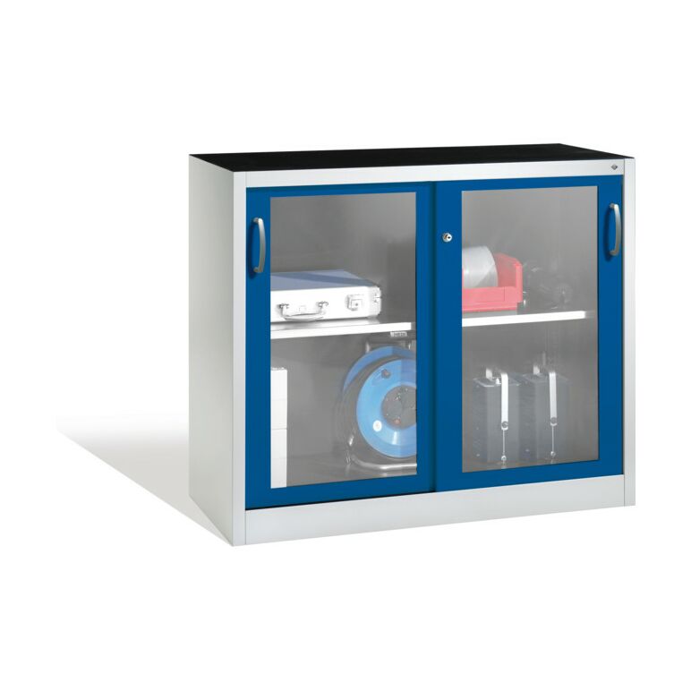 C+P Werkzeugschrank mit Sichtfenster-Schiebetüren, 1 Boden, H1000xB1200xT500mm Front Enzianblau Korpus Lichtgrau