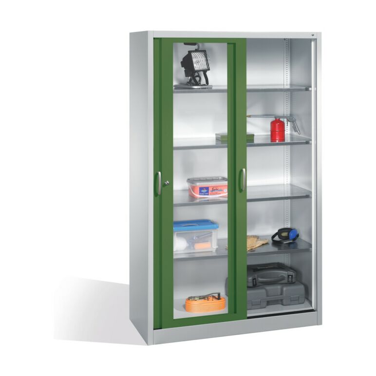 C+P Werkzeugschrank mit Sichtfenster-Schiebetüren, 4 Böden, H1950xB1200xT500mm Front Resedagrün Korpus Lichtgrau