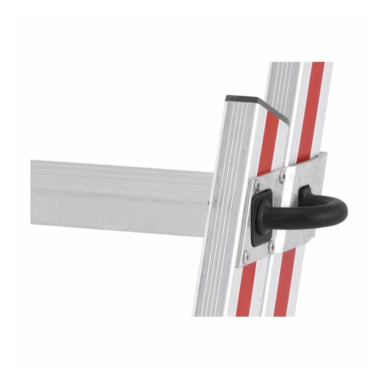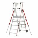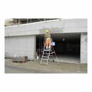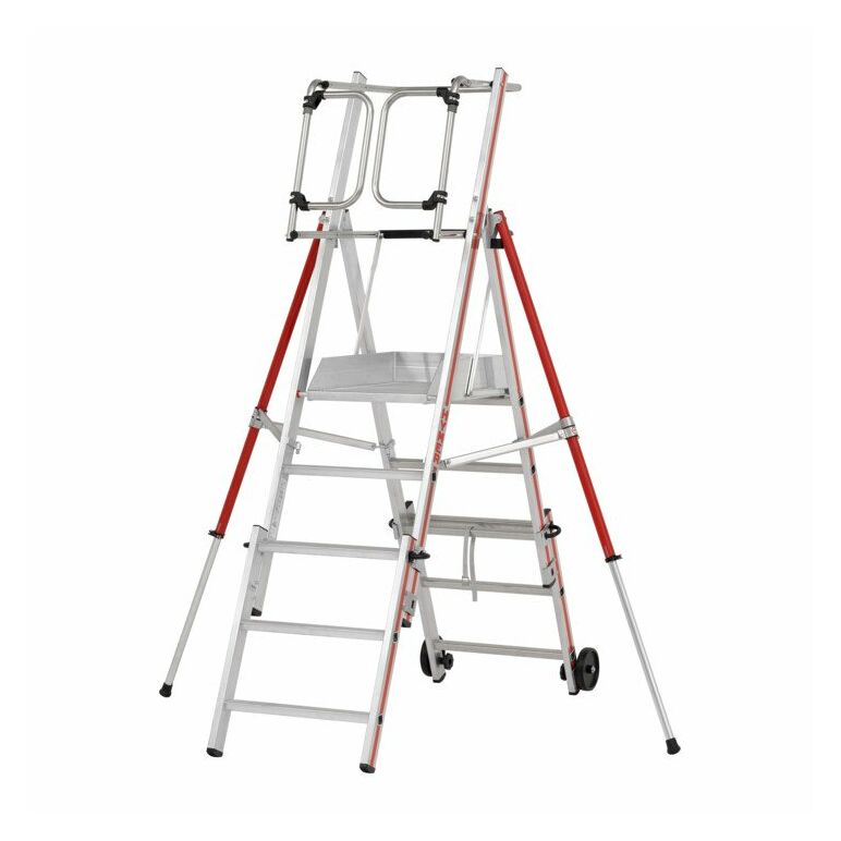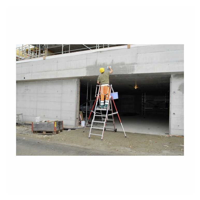 Sicheres, freihändiges Arbeiten durch Geländer und Knieleiste auf allen Seiten · Komfortabler Zugang durch selbstschließende Sicherheitstüre · Sicherer Stand durch stufenlos verstellbare Ausleger · Praktische Ablageschale, in 2 Höhen montierbar · Geräumige Plattform 600 × 425 mm · Bequemer Aufstieg durch 50 mm tiefe Breitsprossen · Mit teleskopierbaren Leiterteilen zur Höhenverstellung im Sprossenabstand
