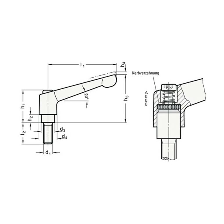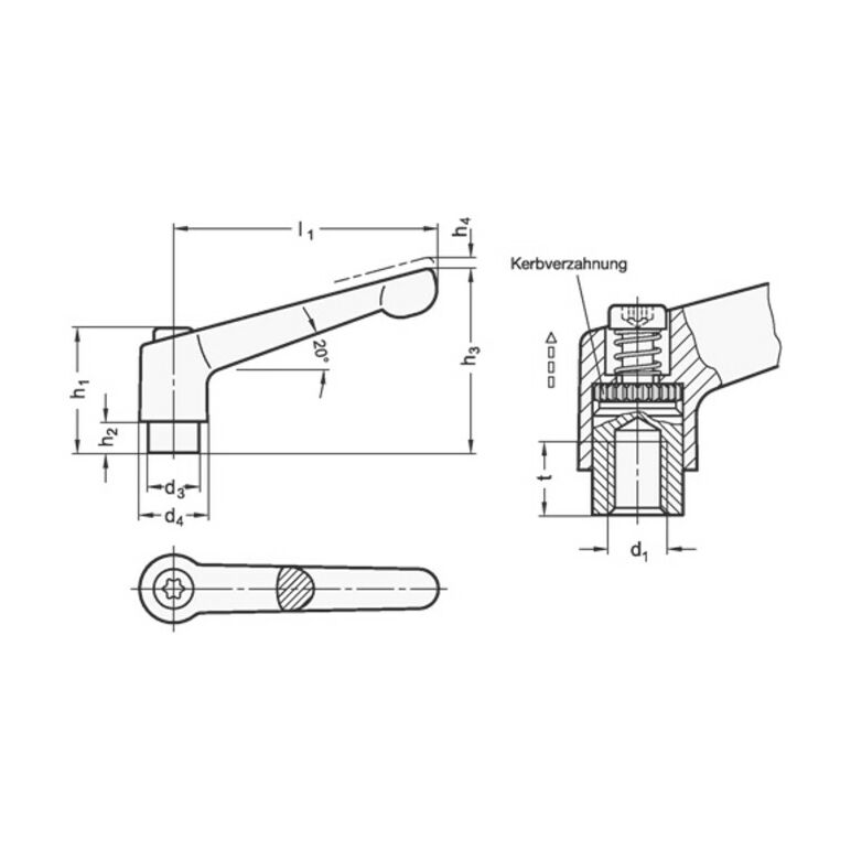 sind vorzugsweise dann einzusetzen, wenn der Spannbereich begrenzt der eine bestimmte Spannstellung erwünscht ist · durch Anheben (Ziehen) des Griffes wird die Kerbverzahnung frei und der Klemmhebel kann in die günstigste Spannposition geschwenkt werden · beim "Loslassen" rastet der Griff selbsttätig wieder ein · Griffkörper · Zink-Druckguss · Gewindebuchse und Halteschraube · Stahl, brüniert Weitere technische Eigenschaften: · d4: 17,5mm · h2: 6,5mm · h4: 4mm · l1: 63mm · h1: 31mm · d1: M 8mm · d3: 13,5mm · h3: 45mm