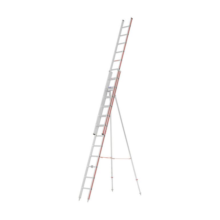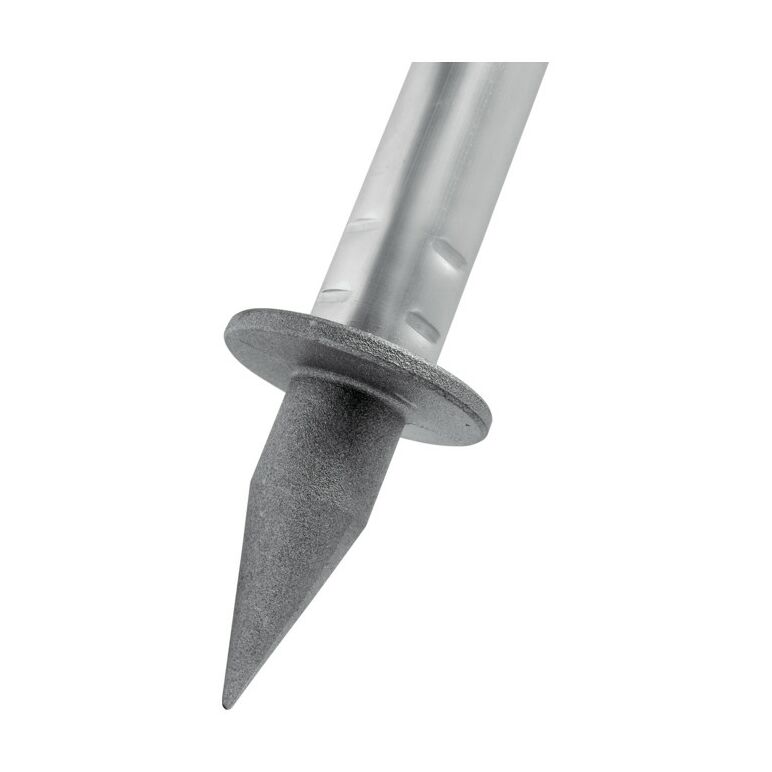 Von Sprosse zu Sprosse verstellbare Schiebeleiter · Unterteil mit geführten Alu-Stützen · Stützen höhenverstellbar · Verstellbereich 280 mm, innerhalb dessen die Stützen im Abstand von 140 mm abgesteckt werden können · Serienmäßig mit 70 mm langen Alu-Spitzen · Spreizsicherung mittels verstellbaren, hochfesten Perlonseilen · Maximale Belastung 100 kg (1,0 kN) · Verwendung nur auf gewachsenem Boden
