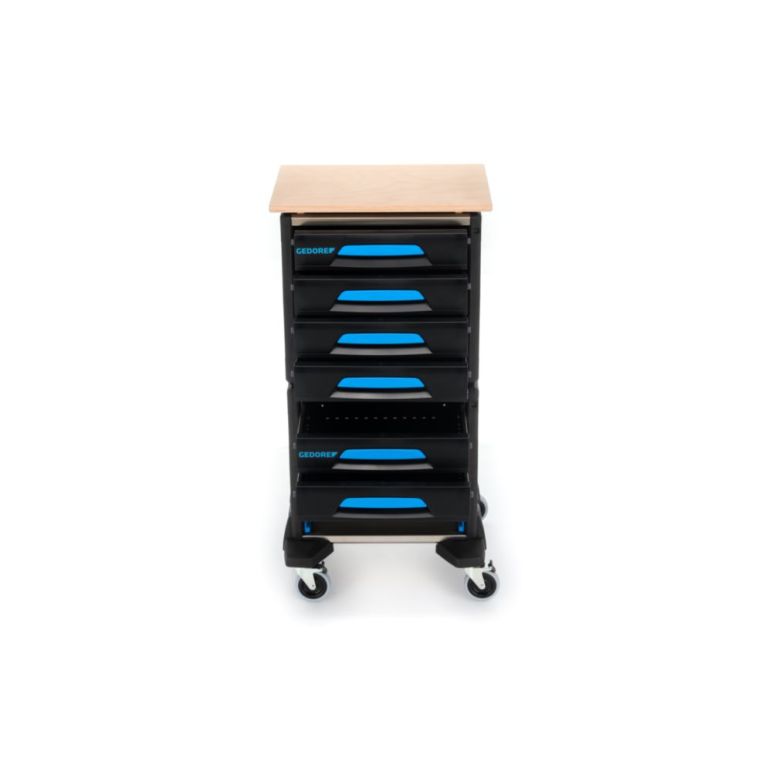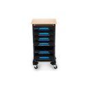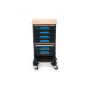 PRAKTISCH: In sechs Schubladen kann Ihr Werkzeug übersichtlich aufbewahrt werden. Zusätzlich verfügt der Wagen über eine Arbeitsplatte aus Holz, die für Montagearbeiten vor Ort genutzt werden kann.