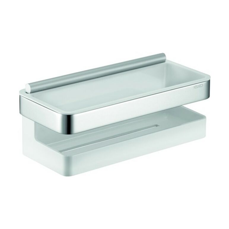 KEUCO COLLECTION MOLL Duschkorb mit Glasabzieher 12759010000 Hochglanzverchromter Haltering aus Metall mit herausnehmbarem, seifenbeständigem, bruchfestem und UV-unempfindlichem Kunststoffeinsatz, weiß Glasabzieher aus eloxiertem Aluminium, 220 mm breit, 60 mm hoch, mit Puffern an beiden Enden, leicht zu reinigen, Gesamtbautiefe 110 mm, Bauhöhe 80 mm, Gesamtbreite 240 mm Der Metallhalter wird verdeckt angebracht Lieferung inkl. korrosionsfreiem Befestigungsmaterial