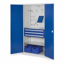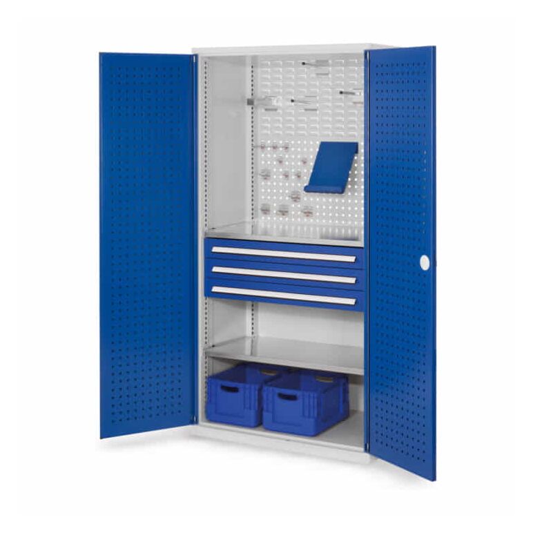 • Türinnenseite: Lochplatten, 1950 x 1000 x 600 mm, 3 Schubladen H 100 mm, 2 Fachböden verzinkt