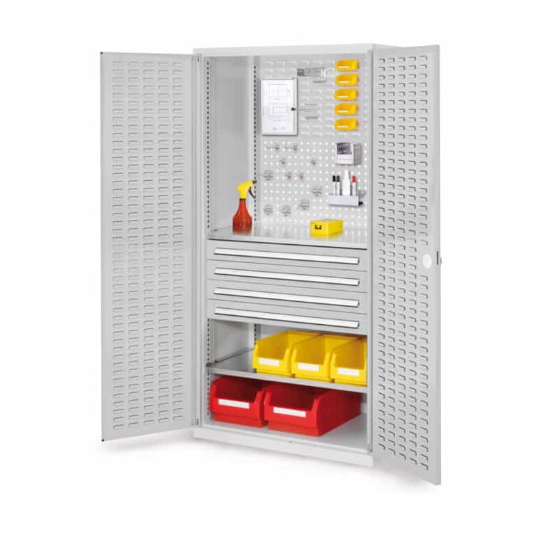 • Türinnenseite: Schlitzplatten 1950 x 1000 x 600 mm, 4 Schubladen H 100 mm, 2 Fachböden verzinkt