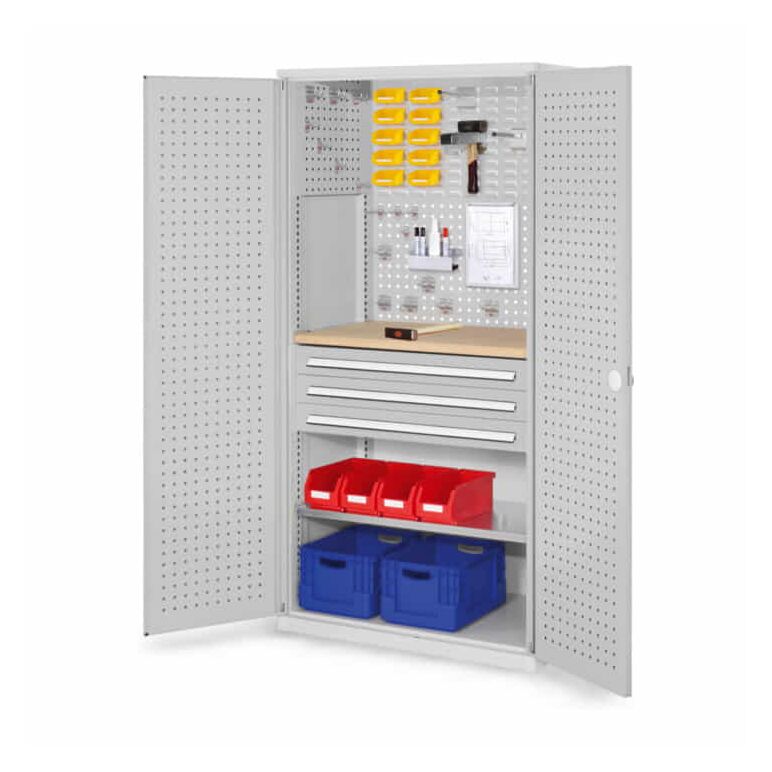 RasterPlan Lochplatteenschrank mit 3x Schubladen, Fachboden und Werkbank | HxBxT 1950 x 1000 x 600 mm | Grau