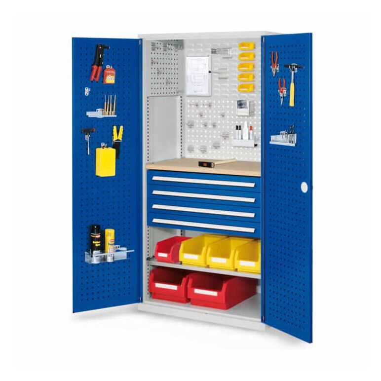 Kappes RasterPlan Lochplatteenschrank mit 4X Schubladen, Fachboden und Werkbank | HxBxT 1950 x 1000 x 600 mm | Blau