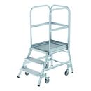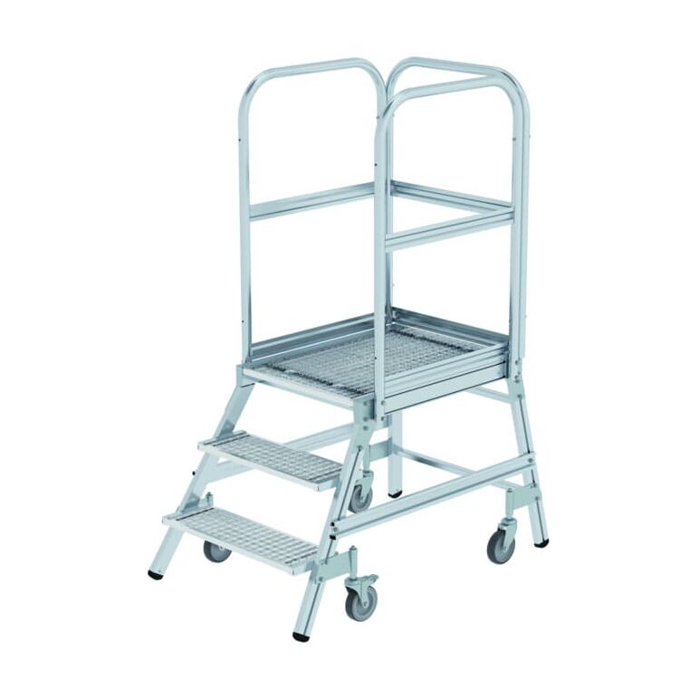 Stufen- und Plattformausführung: Stahl-Gitterrost Stabile Aluminium-Rechteckrohrholme 200 mm tiefe Stufen Komplett mit dreiseitigem Geländer mit Fuß- und Knieleiste 4 selbstarretierende Lenkrollen ø 125 mm, davon 2 mit Feststeller
