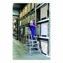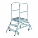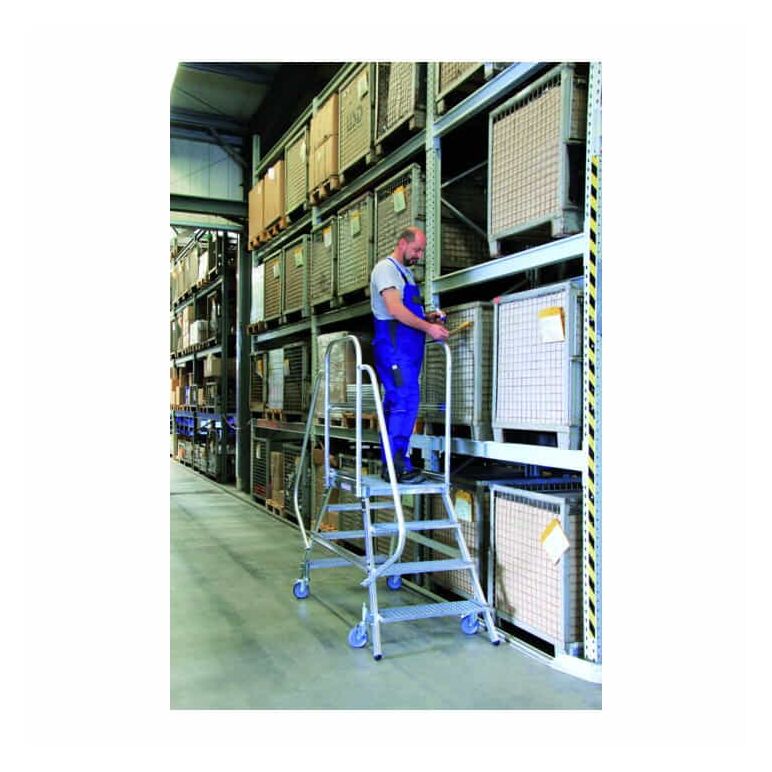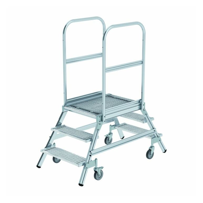 Stabile Aluminium-/Rechteckrohrholme 200 mm tiefe StufenKomplett mit beidseitigem Geländer mit Fuß- und Knieleiste 4 selbstarretierende Lenkrollen ø 125 mm, davon 2 mit Feststeller Versand erfolgt in Bauteilen, ausführliche Aufbauanleitung liegt bei