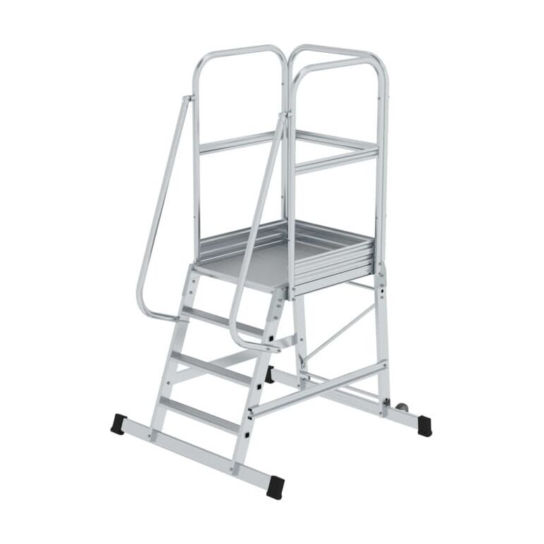 Aufstiege bestehend aus Stufenanlegeleitern mit eingebördelten Stufen Plattform aus geriffeltem Aluminium-Profil Dreiseitiges Plattformgeländer 1100 mm mit Fuß- und Knieleisten sowie beidseitige Handläufe serienmäßig 2 Quertraversen für hohe Standsicherheit Mit 2 Rollen Ø 100 mm für bequemes Verfahren an flexible Einsatzorte Zulässige Gesamtbelastung 150 kg Andere Abmessungen auf Anfrage