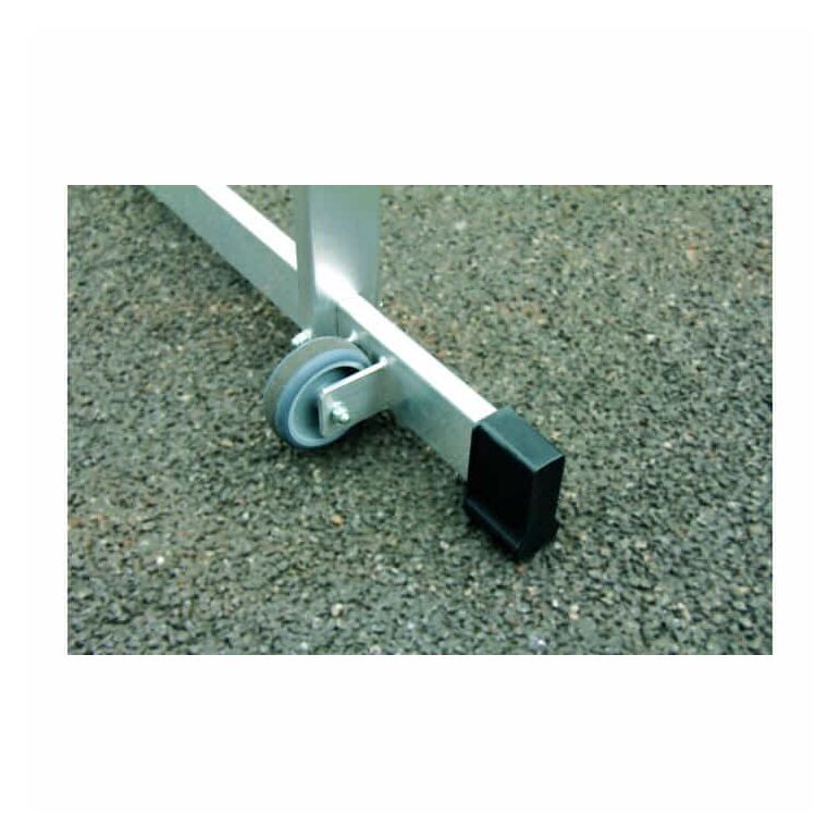 Aufstiege bestehend aus Stufenanlegeleitern mit eingebördelten Stufen Plattform aus geriffeltem Aluminium-Profil Dreiseitiges Plattformgeländer 1100 mm mit Fuß- und Knieleisten sowie beidseitige Handläufe serienmäßig 2 Quertraversen für hohe Standsicherheit Mit 2 Rollen Ø 100 mm für bequemes Verfahren an flexible Einsatzorte Zulässige Gesamtbelastung 150 kg Andere Abmessungen auf Anfrage