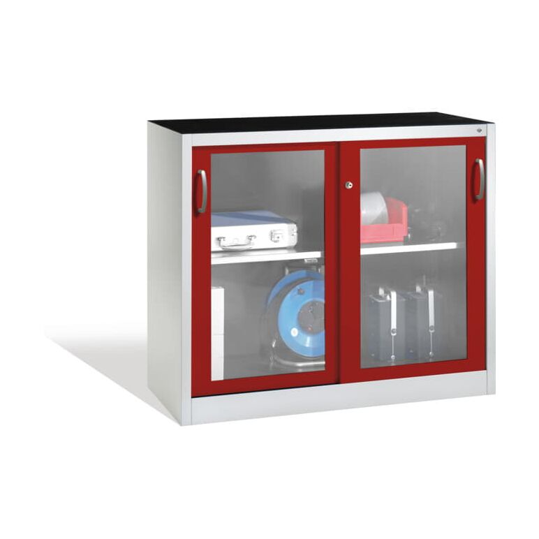 C+P Werkzeugschrank mit Sichtfenster-Schiebetüren, 1 Boden, H1000xB1200xT500mm Front Rubinrot Korpus Lichtgrau