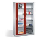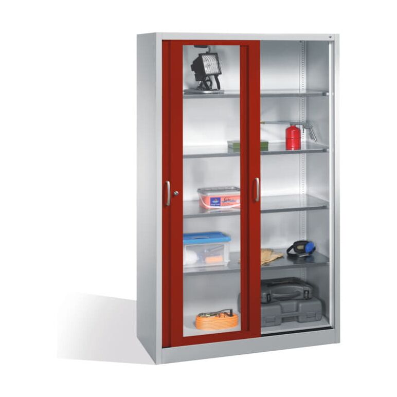 C+P Werkzeugschrank mit Sichtfenster-Schiebetüren, 4 Böden, H1950xB1200xT500mm Front Rubinrot Korpus Lichtgrau