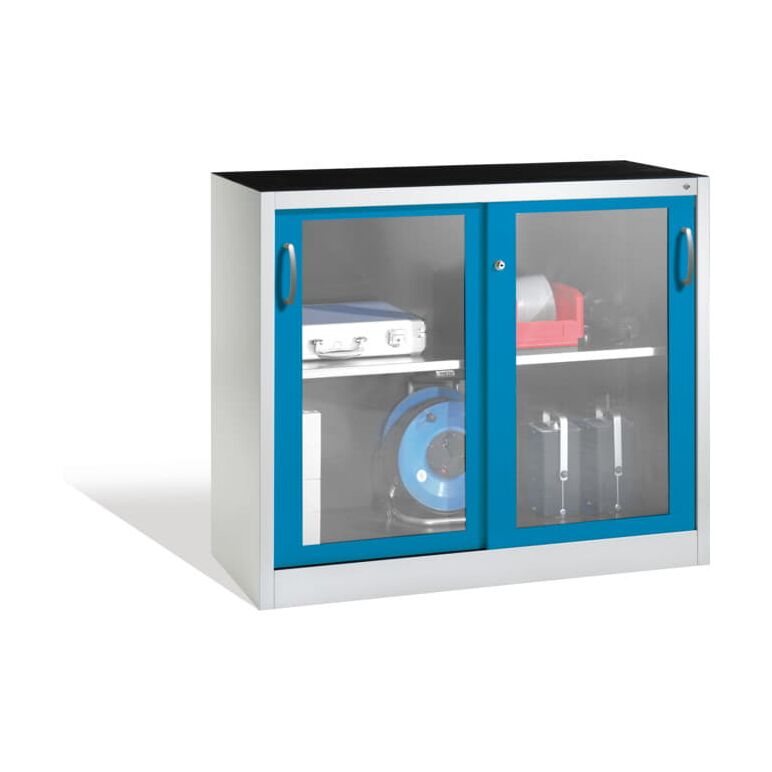 • 1x C+P Werkzeugschrank mit Sichtfenster-Schiebetüren, 1 Boden, H1000xB1200xT500mm Front Lichtblau Korpus Lichtgrau