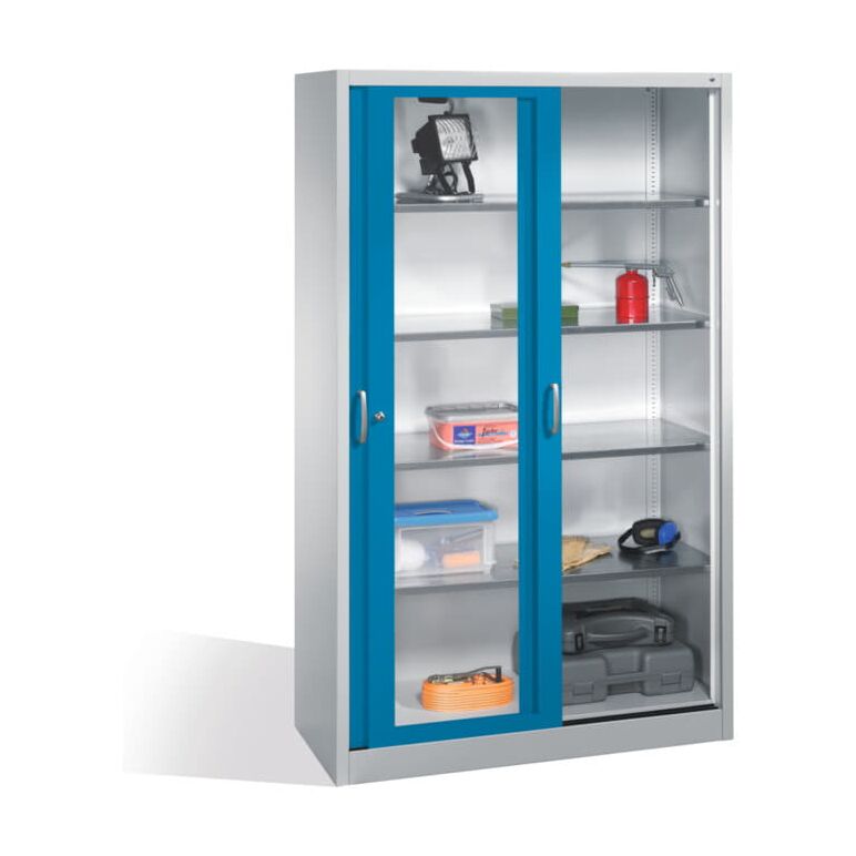 C+P Werkzeugschrank mit Sichtfenster-Schiebetüren, 4 Böden, H1950xB1200xT500mm Front Lichtblau Korpus Lichtgrau
