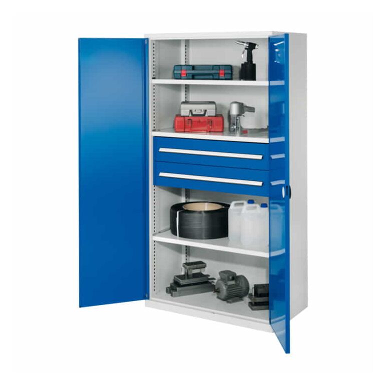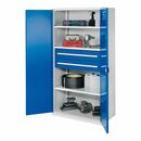 Schwerlastschrank ohne Mitteltrennwand, 1950 x 1000 x 600 mm, Modell 42, RAL 7035/5010 | Doppelwandtür, 3 Fachböden verzinkt, 2 Schubladen 175 mm