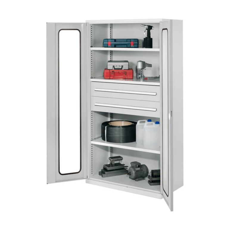 Kappes Schwerlastschrank ohne Mitteltrennwand, 1950 x 1000 x 600 mm, Modell 42, RAL 7035 | Sichtfenstertür | 3 Fachböden verzinkt, 2 Schubladen H175 mm